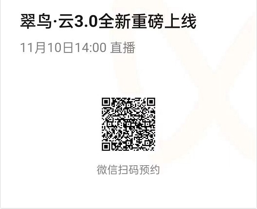 最后,翠鸟·云3.0将于2022年11月10日14:00正式发布,现在别忘了拿起手机,扫下面码上预约,我们不见不散!